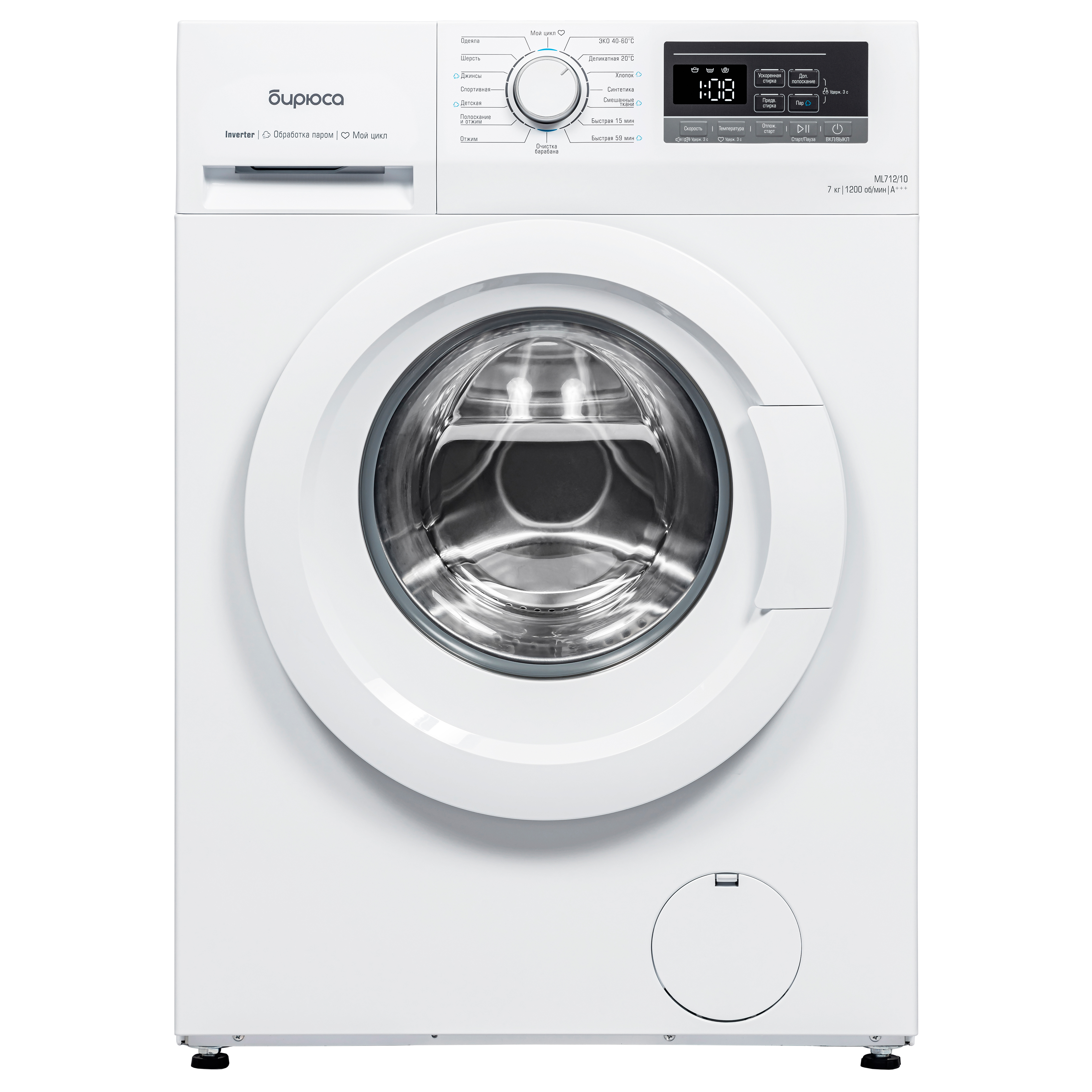 инверторный мотор, обработка паром, регулируемые ножки, автовзвешивание, дозагрузка белья, регулируемая температура